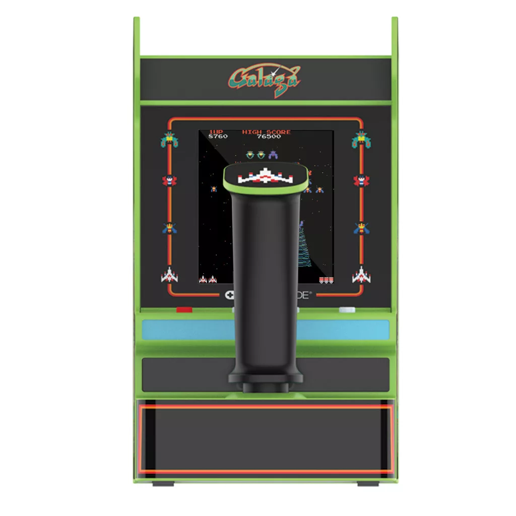 - Az eredeti GALAGA árkád szekrénye által ihletett grafikával.