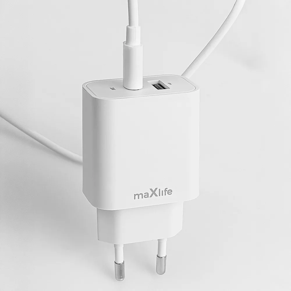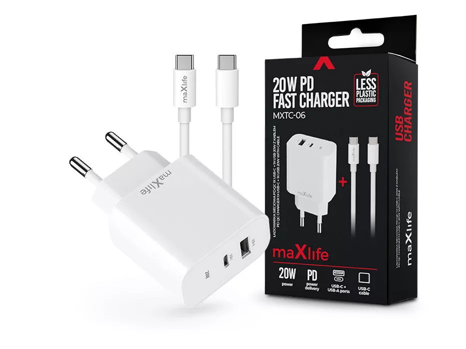 Maxlife MXTC-06 PD+QC 20W hálózati gyorstöltő adapter USB + Type-C + Type-C/Type-C kábel - fehér