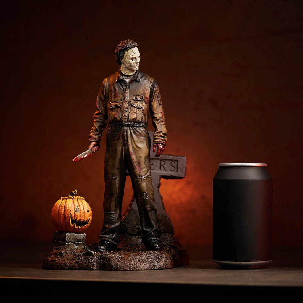 - Ez a figura Michael Myers-t ábrázolja, aki egy tök mellett áll, sírkővel a kezében, késsel a kezében, 23 cm magas.