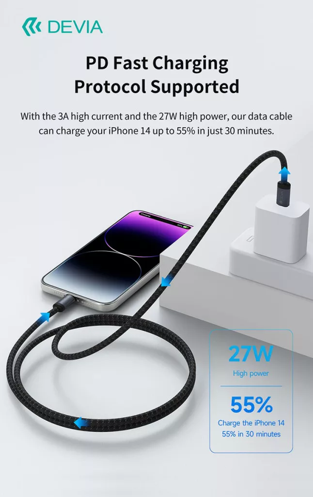 Devia Gracious Series 27W PD Type-C/Lightning adat- és töltőkábel 1m - fekete