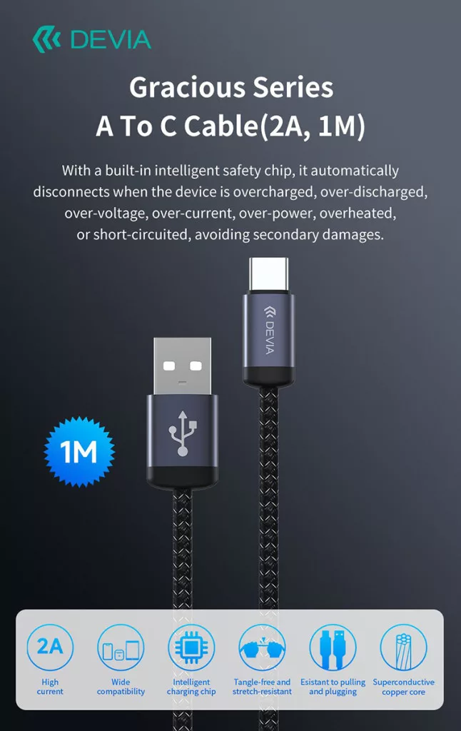 Devia Gracious Series 10W USB/Type-C adat-és töltőkábel 1m - fekete