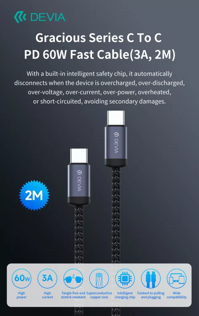 Devia Gracious Series 60W PD Type-C/Type-C adat- és töltőkábel 2m - fekete