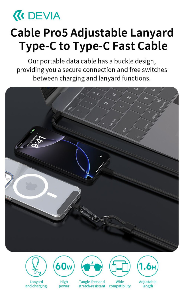- Kifejezetten erős zsinórként tervezve – állítható hosszúságú kábellel és nyakba vagy kézbe akasztható pánttal – a Devia Pro5 egyszerű hordozhatóságot és gyors hozzáférést biztosít, így ideális megoldás azoknak a felhasználóknak, akik folyamatosan úton vannak.