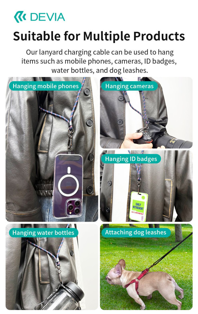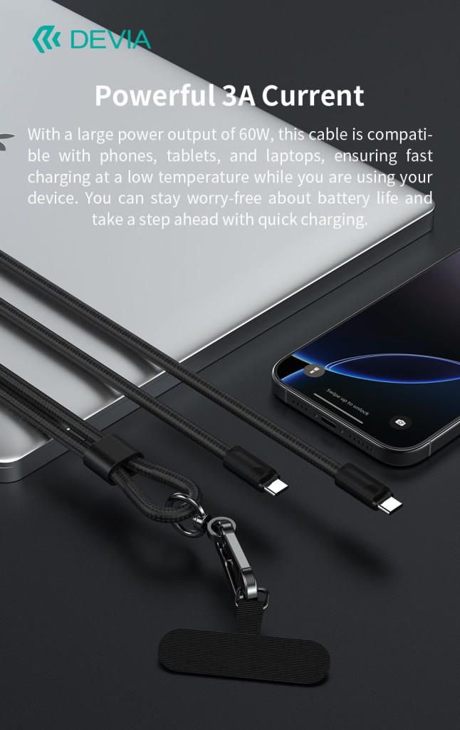 - Kifejezetten erős zsinórként tervezve – állítható hosszúságú kábellel és nyakba vagy kézbe akasztható pánttal – a Devia Pro5 egyszerű hordozhatóságot és gyors hozzáférést biztosít, így ideális megoldás azoknak a felhasználóknak, akik folyamatosan úton vannak.