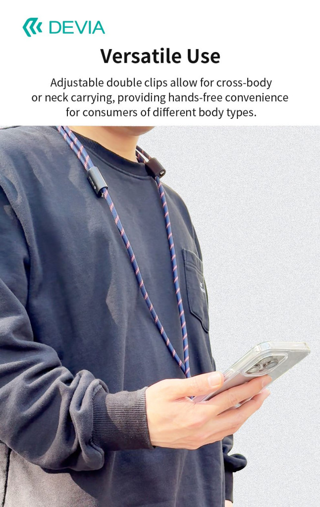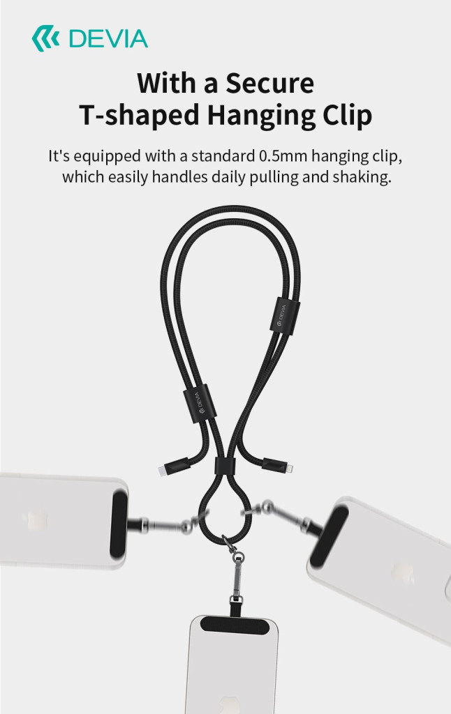 - Kifejezetten nyakba akasztható kábelként tervezve, állítható hosszúsággal és nyakba vagy kézbe akasztható pánttal, a Devia Pro5 egyszerű hordozhatóságot és gyors hozzáférést biztosít – ideális megoldás azoknak a felhasználóknak, akik folyamatosan úton vannak.
