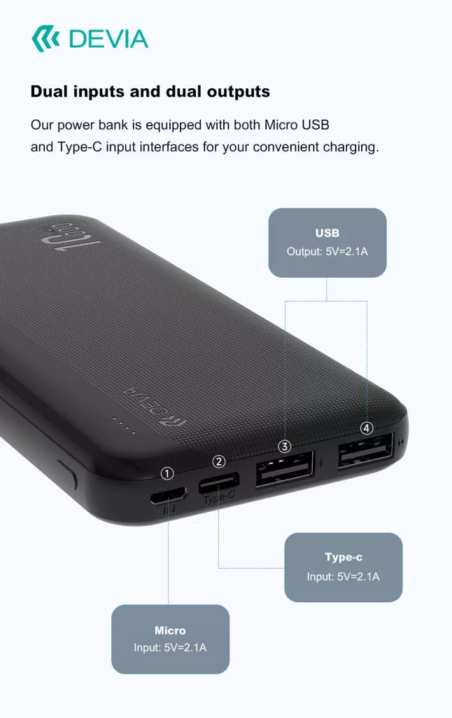 Devia Kintone Series Lite 5 - 2xUSB + Type-C + microUSB - powerbank - 10.000 mAh - fekete