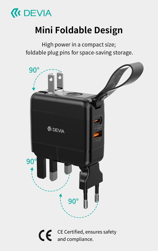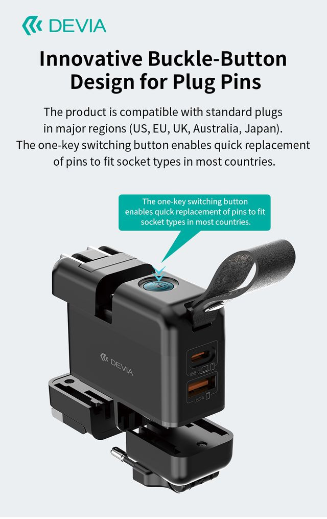 Devia Global 45W PD+QC hálózati gyorstöltő utazó adapter (CN/JP/US/EU/UK/AU) - fekete