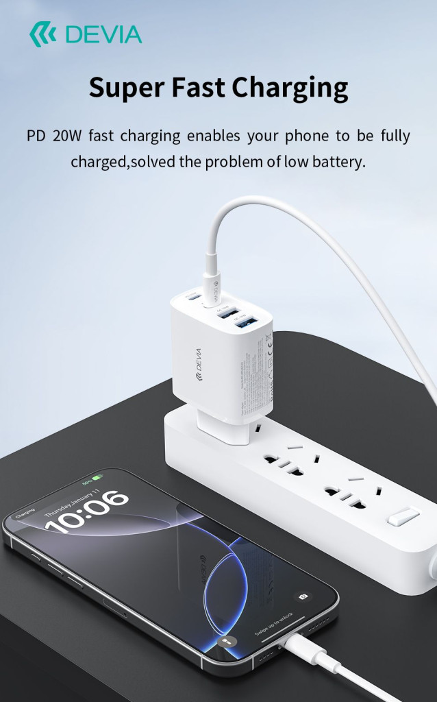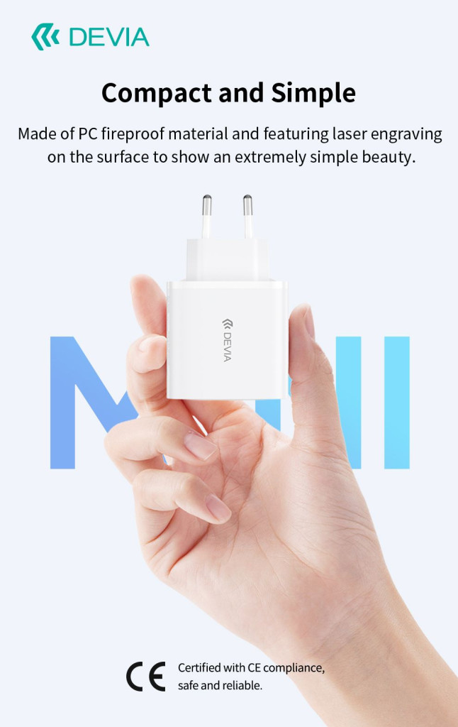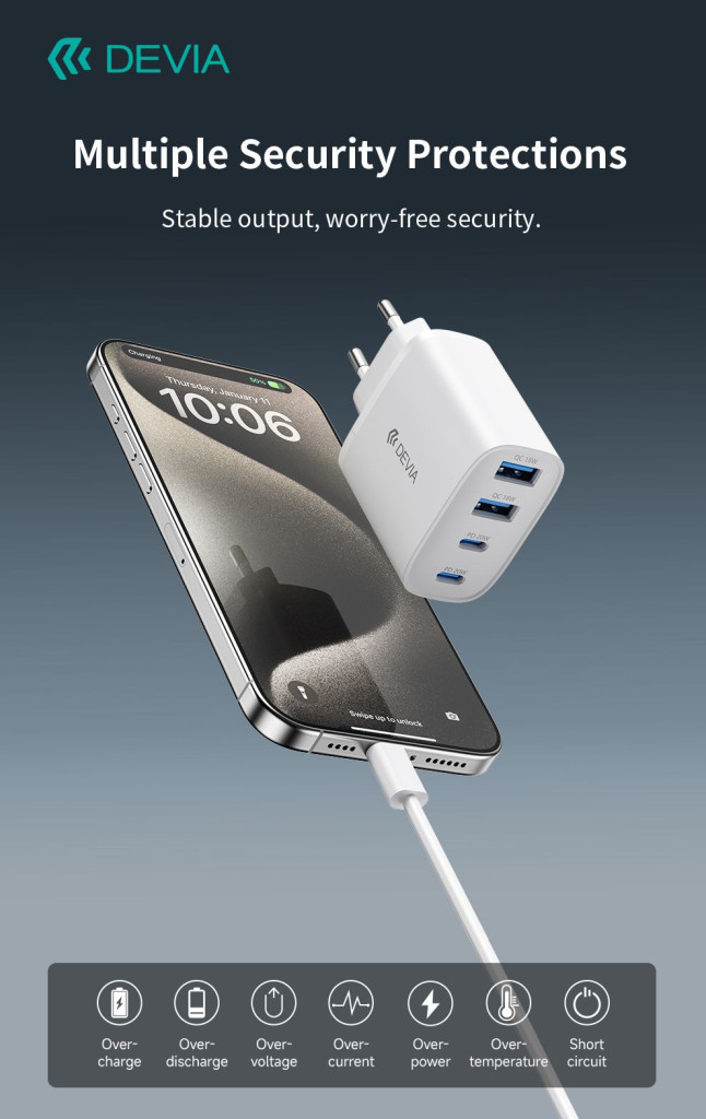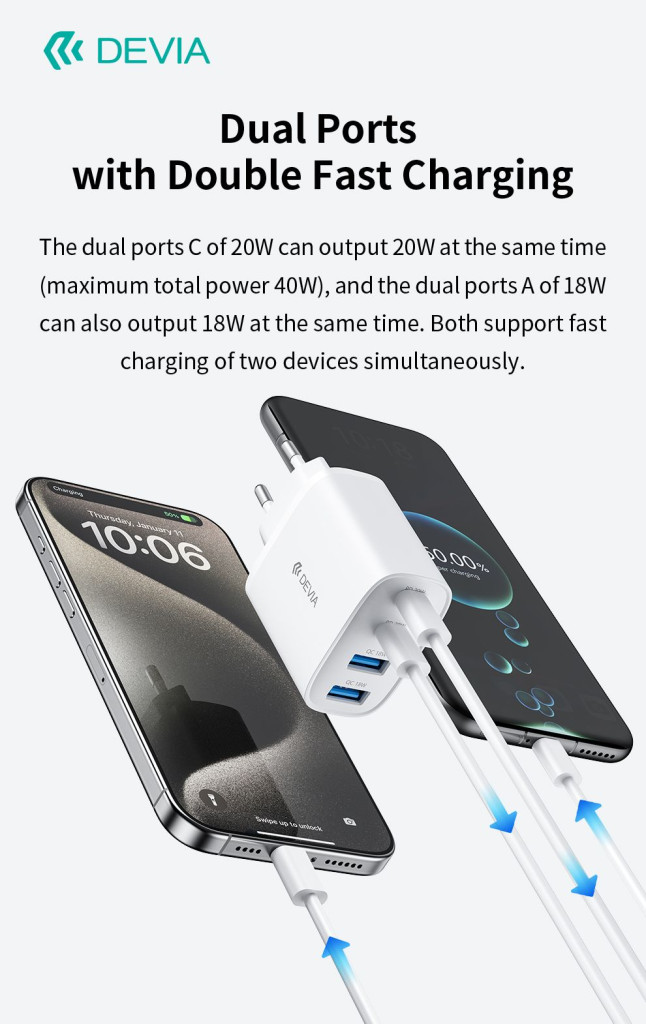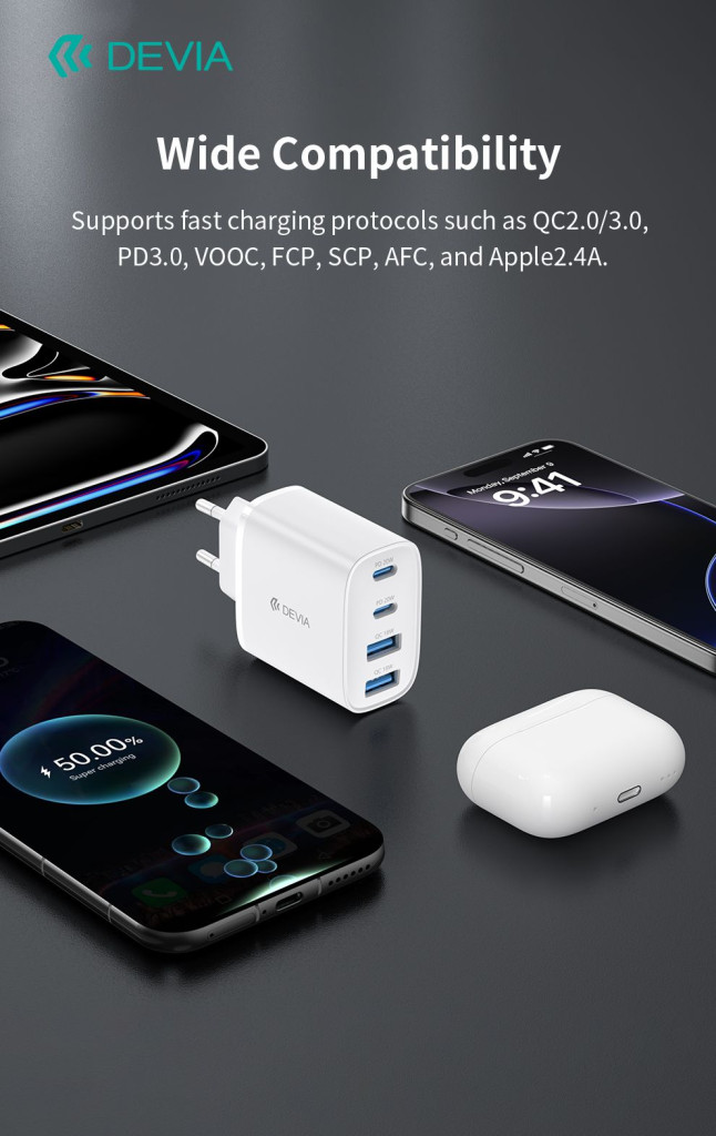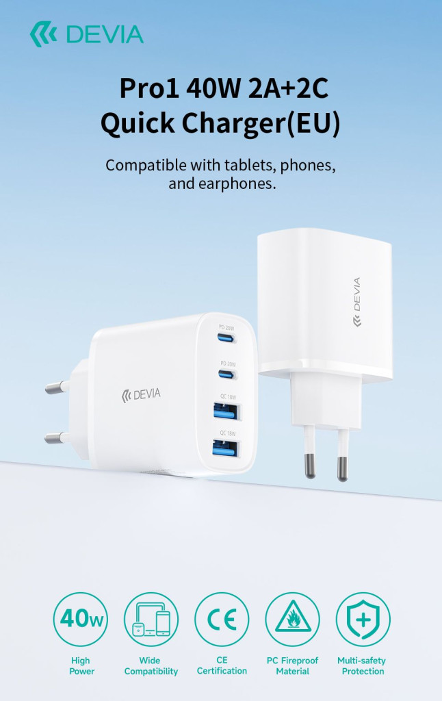 Devia Pro1 40W GaN QC 2xUSB + 2xType-C hálózati gyorstöltő adapter - fehér