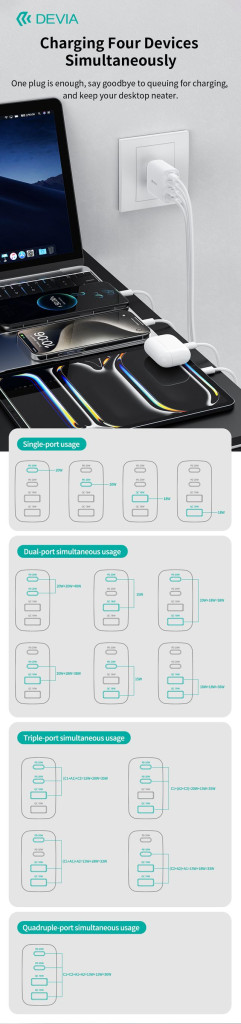 - USB-C1/C2+USB-C1+USB-A1/USB-C2+USB-A2: Max. 35W (20W + 15W)