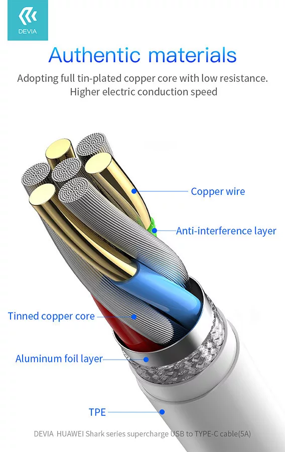 - Az 5A-es gyors töltéshez beépített, 20 AWG-os megvastagított, tiszta ónbevonatú rézvezetéket használnak a veszteségek minimalizálása és a gyors, azonnali töltés érdekében