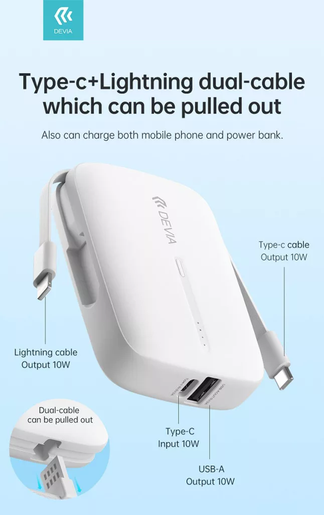 Devia Kintone Series - USB + Type-C - powerbank + Type-C/Lightning kábel - 10.000 mAh - fehér