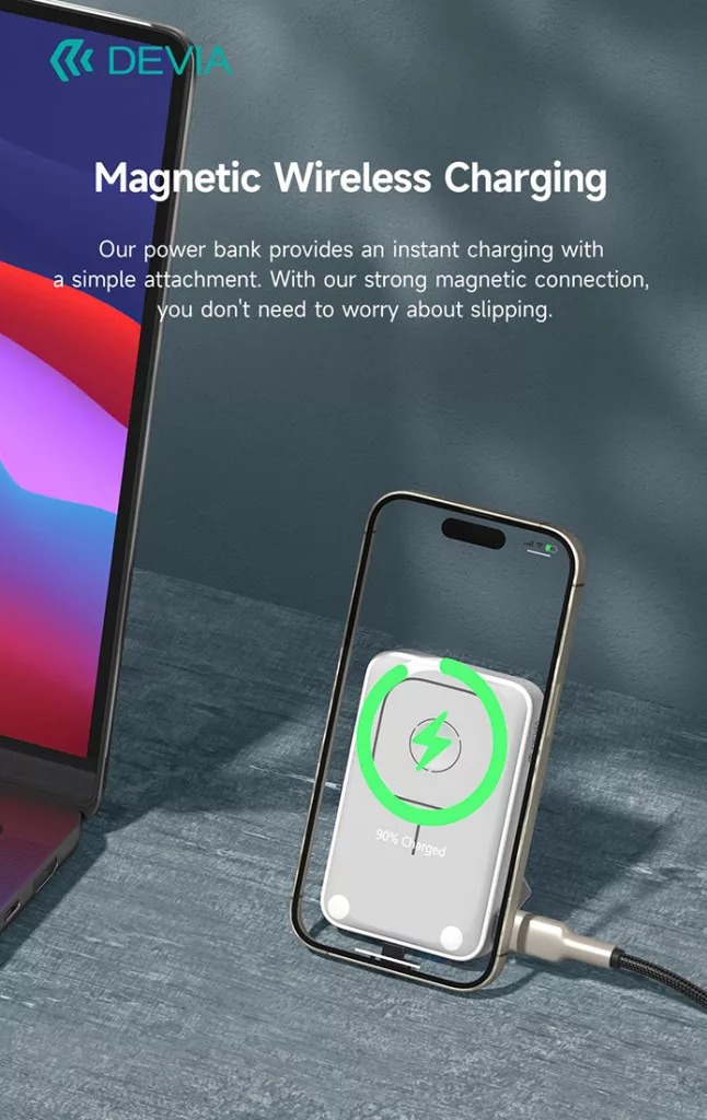 - Powerbank azonnali töltést biztosít egy egyszerű rögzítéssel. Erős mágneses kapcsolatunknak köszönhetően nincs szüksége aggódnia a csúszás miatt.