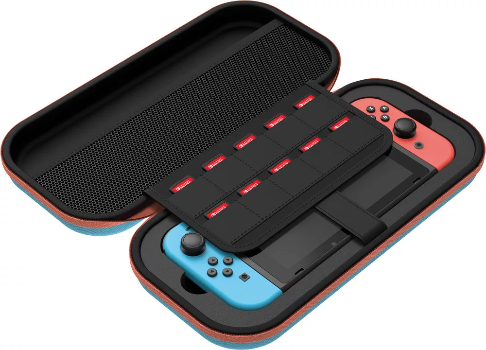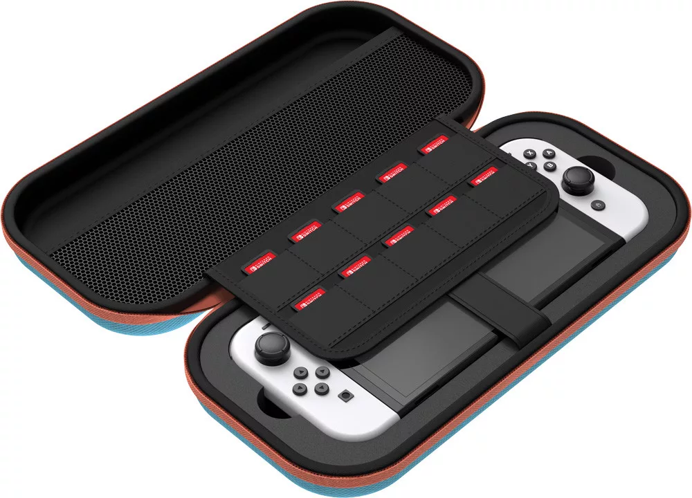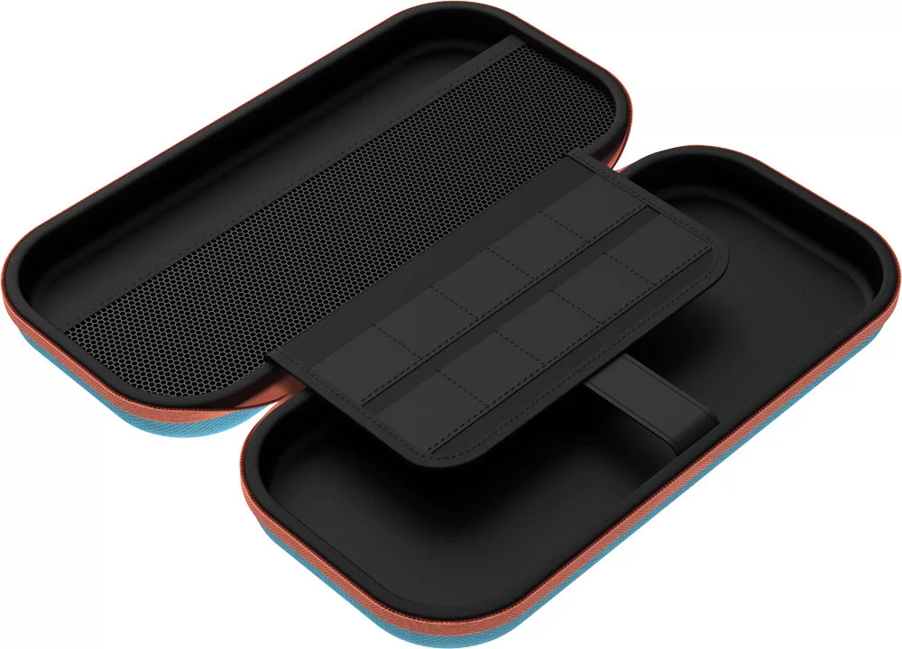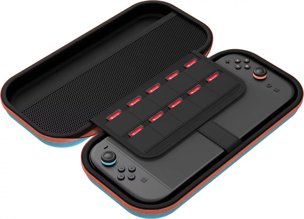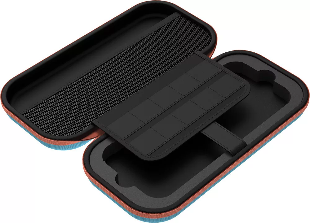 - A stílusos kék-narancs színű hordtáska megbízható védelmet nyújt utazás közben is, miközben tökéletesen illeszkedik a Nintendo Switch 2, Switch, OLED és Lite modellekhez.