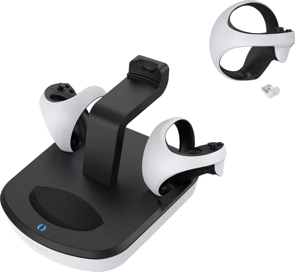 - Magát a VENOM VS5014 PS VR2 töltőállomást a hálózaton vagy USB-n keresztül töltheted. Található rajta egy állvány is a fejhallgatók számára. A színes töltésjelzők mindig tájékoztatnak a készülék állapotáról. Az állomás a PS5-tel kompatibilis.
